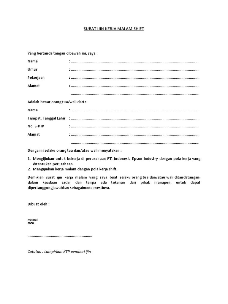 Cara membuat surat izin orang tua untuk melamar pekerjaan dketik from. Izin untuk bekerja malam hari. Dengan ini memberikan izin kepada anak saya untuk mengikuti kegiatan praktek kerja industri (prakerin) di pt astra indonesia cikarang selama 3 bulan terhitung . Keterangan kerja alphapay contoh surat izin kerja malam pt epson. Fungsinya sendiri kemudian beragam, dan tentunya berkenaan dengan tujuan dari karyawan yang mengajukan permohonan pembuatannya.